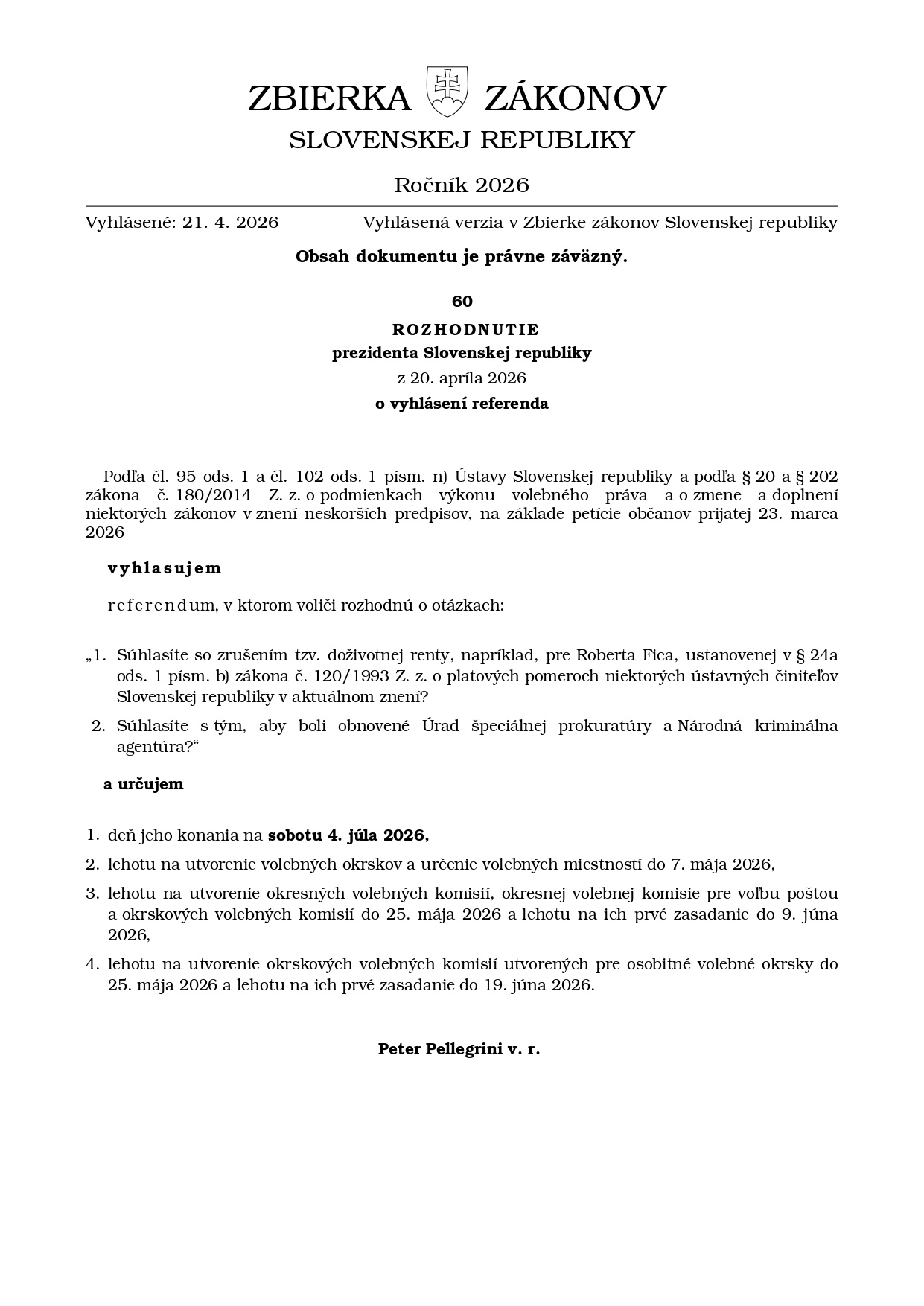 R O Z H O D N U T I E prezidenta Slovenskej republiky z 20. apríla 2026 o vyhlásení referenda